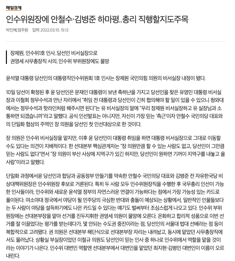 안철수 인수위원장과의 역할 분담 / 여당내 분열 이슈 (승리 기여론)