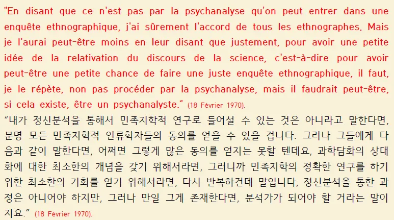 메타 형식이 있음을 이야기하는 정신 분석의 설명은 민족지학의 탐사를 구체화해줄 무엇이 되지 못한다. 민족지학의 구체화된 구조를 정식분석에 적용한다면 이 역시 거꾸로 정신분석을 하나의 개별사례를 보편적 신화(과학담화)로 이끄는 왜곡이 될 것이다. 프로이트의 외디푸스 신화처럼 말이다.