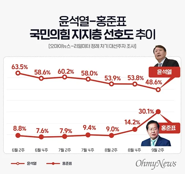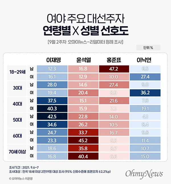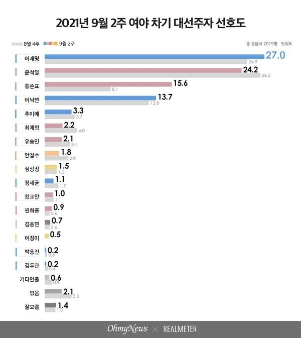 <오마이뉴스>는 여론조사기관 리얼미터에 의뢰해 지난 9월 6일부터 7일까지 2일간 전국 만 18세 이상 유권자 2019명(응답률 5.5%)을 대상으로 실시했다. 이번 조사는 무선(90%)·유선(10%) 자동응답 혼용 방식으로, 병행 무작위 생성 표집틀을 통한 임의 전화걸기로 진행했다.