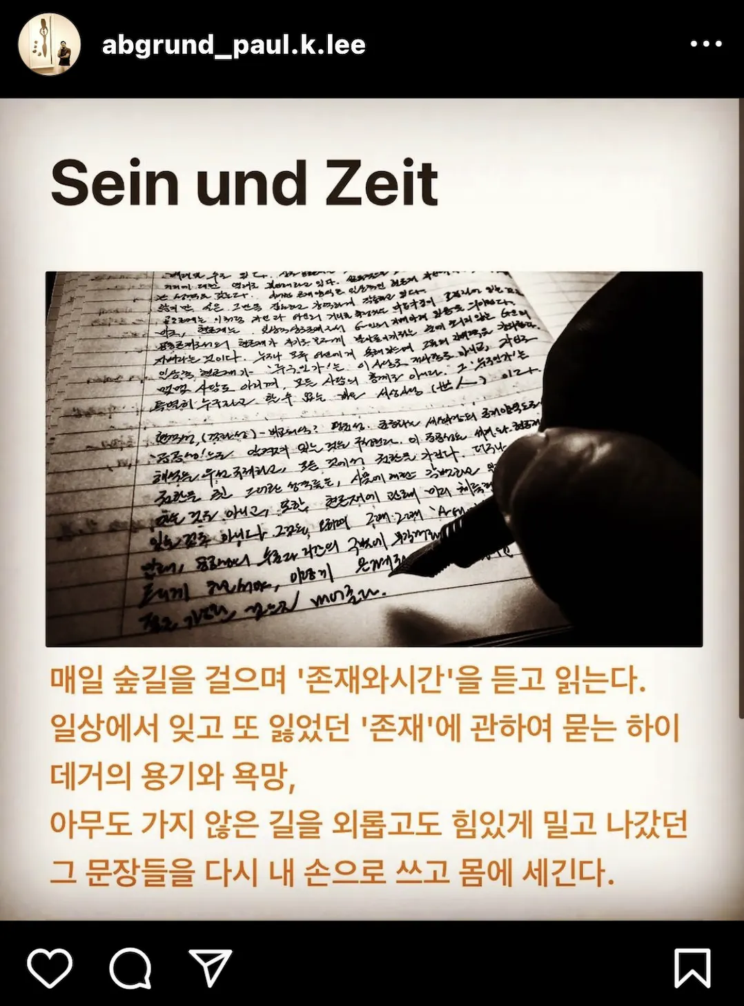 유일하게 해보지 않은 것은 “길을 가지 않는 것”이었다. 그 상상 - 욕망 - 의미 - 추구 - 성공 또는 실패 - 의미의 퇴색 - 허무 - 불안 - 또 상상…의 반복의 길을 가는 것은 무한히 인생을 통해 돌아 걸었다. 결국 멈추었고 그 불안과 우울함 속에서 하이데거를 만났다.