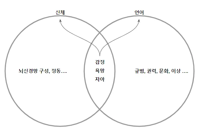 즉 감정, 욕망, 자아… 등 우리가 살아가는 의식의 세계 속에서 이해할 수 있는 영역 - 우리는 이것을 진정한 자기의 모습이라고 착각하지요 -에 대해 잘 알고 있다고 생각합니다. 하지만 신체와 언어가 교집합 되어 있는 부분은 사실 정말 이질적인 맞지 않는 성격의 교집합입니다. 언어로 구성된 문명의 질서와 규범이 우리 몸의 신체예산관리 활동과 어떤 연관성이 있을까요? 이 둘을 억지로 결합한 개념의 예로 사회진화론, 우생학과 같은 것들이 있겠지요. 생각만 해도 비극적입니다.