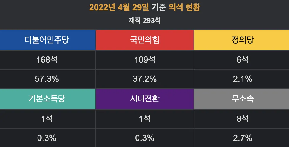 여소야대 : 현재 야당은 민주당 성향의 무소속의원까지 포함하면 300명 중 180명 이상의 의결권을 행사할 수 있는 상태 (무소속 8석중 6석이상이 민주당 관련)