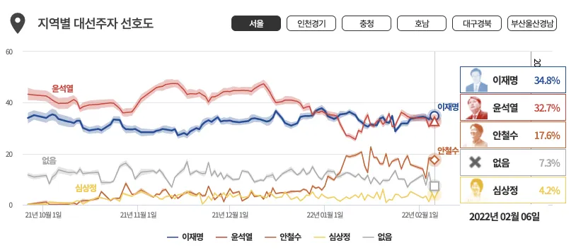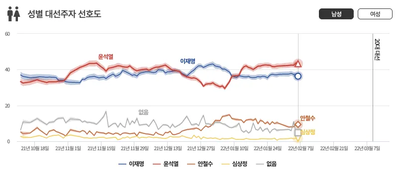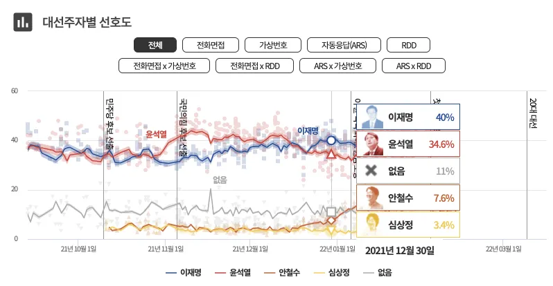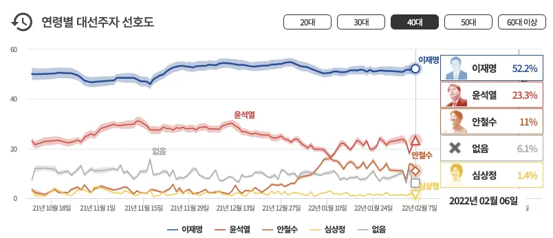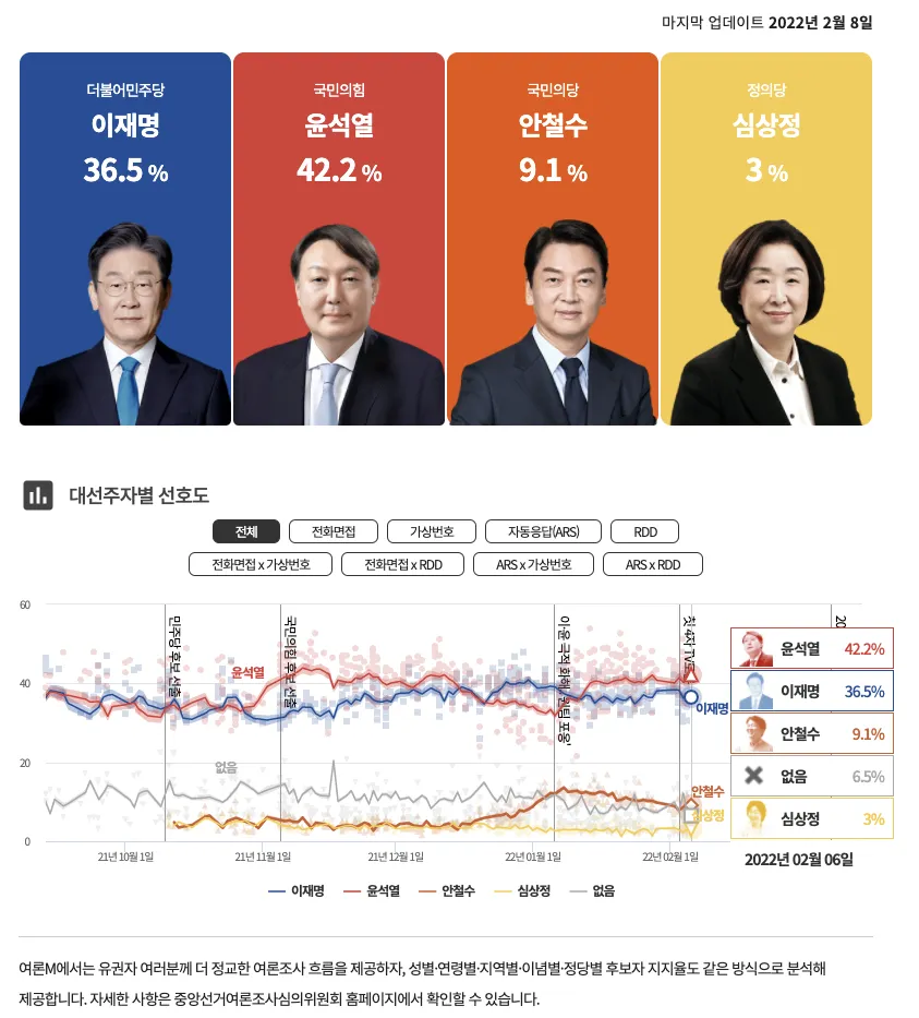 - 통계적으로 이재명을 지지할 확률이 높고 현재 이재명 후보는 오차범위 밖에서 윤석렬 후보의 지지율보다 낮은 여론지지를 받고 있다. (내가 이재명 후보를 지지하는지는 모르겠으나...)
