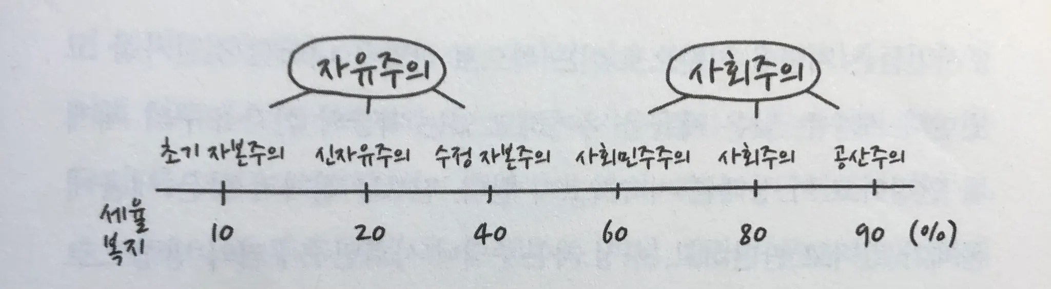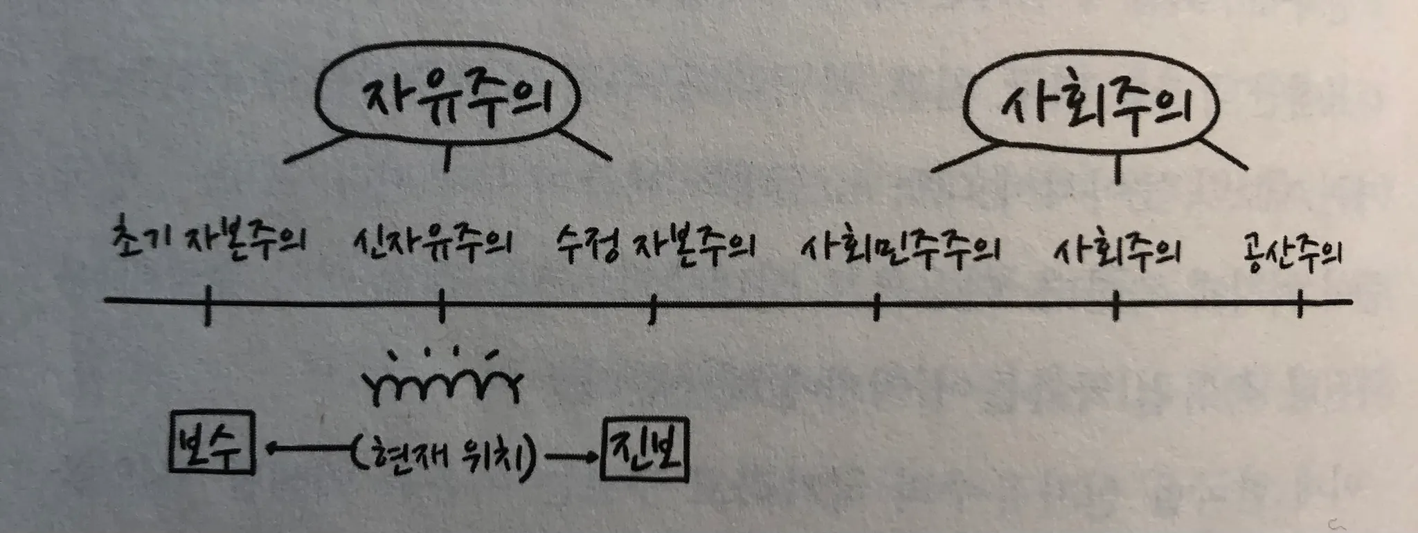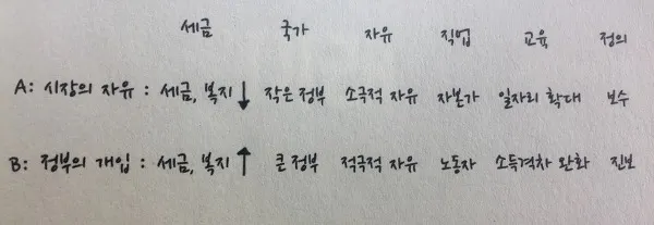 우리는 지금 신자유주의 속에 살고 있으며, 보수는 정부의 개입을 최소화 하는 방향의 자본주의 초기의 모습을 지향하고 진보는 정부의 개입을 통해 시장의 실패와 부의 불평등을 줄이고자 하는 수정자본주의 모델을 지향한다.