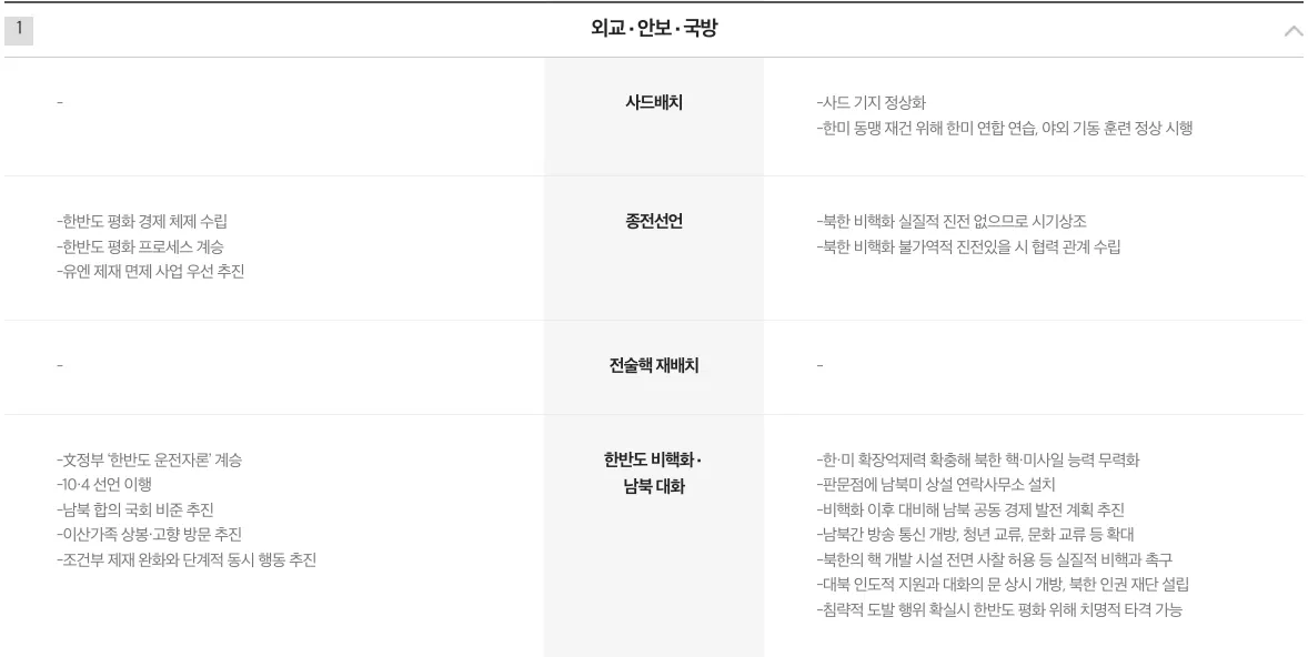 윤석렬 후보는 사드 추가 배치를 통한 힘의 균형-현실주의 매파 기조를 강조한 반면, 이재명 후보는 한반도 평화 체제 및 프로세스 - 남북중미 간 외교적 협상을 통한 동아시아 외교 전략 관점을 가지고 있다.