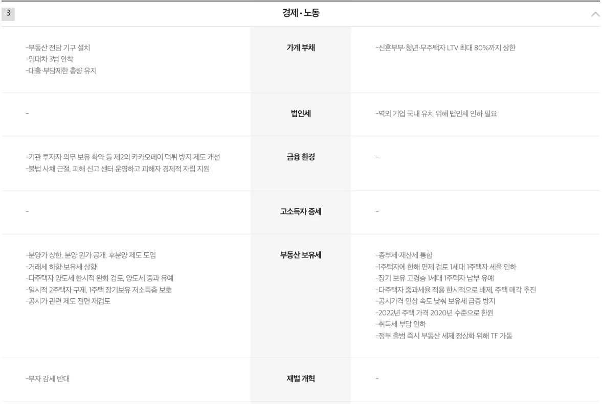 윤석렬 후보는 법인세 인하 및 종부세, 보유세 등의 세율 인하를 / 이재명 후보는 보유세 상향(거래세 완화) 및 부자감세 반대 (증세가능)