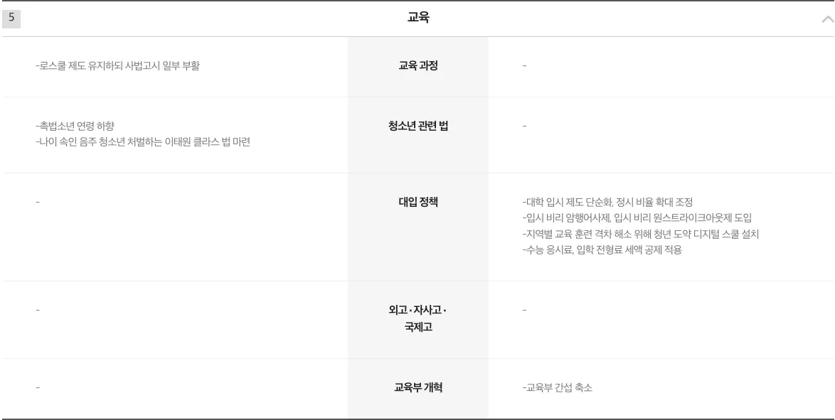 두 후보 모두 교육과 관련된 정책 특히 입시제도나 대학구조 관련 언급이 없는 것은 아쉽다.