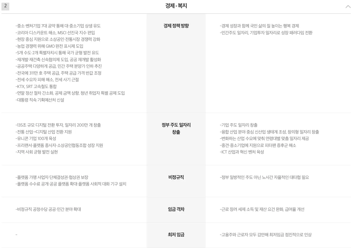 이재명 후보는 공공투자와 민관협력 일자치 창출 계획이 다수인 반면 윤석렬 후보는 민간주도의 일자리 창출과 기업규제 완화를 통한 국가 개입 축소의 방향