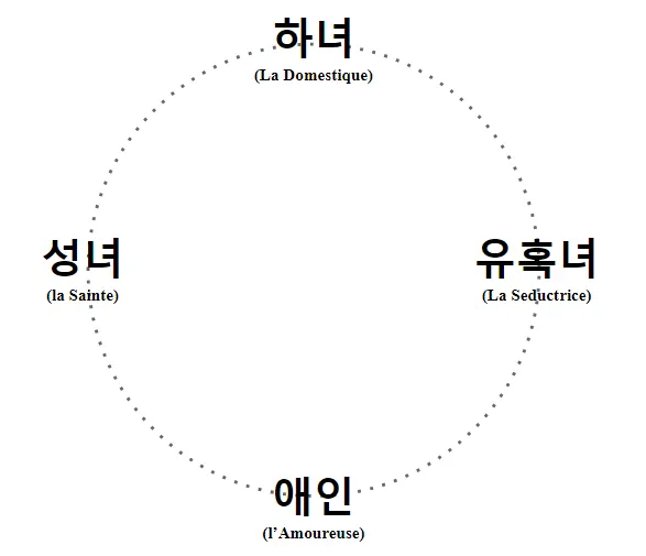 철학자 알랭 바디우는 남성의 시선으로 구축된 여성성의 네가지 형상이 존재한다고 이야기합니다. 그것은 하녀, 유혹녀, 애인, 성년인데요. 이 항들을 언제나 하나로서 존재하기 보다는 두가지 형상이 쌍을 이루어 작동하지요. 이상적인 아내로서 집안일과 자녀를 돌보는 가정 주부인 동시에 밤엔 남편에게 성적 매력을 선물해야 하는 의무를 갖지요. (프로이트의 강박적 남성의 여성상인 어머니와 창녀의 개념과도 연결되지요) 하녀와 유혹녀를 오가는 여성의 성적 매력은 남편이 아닌 남자에게도 향할 수 있고 남편의 어머니 강박에 의해 사랑받지 못하는 여성의 애정은 유혹녀와 타인의 애인 사이를 오가게 되지요. 문명의 억압 속에 다른 남자를 사랑할 수 없는 여성의 욕망은 결국 현실이 아닌 초월자를 향하고 그 사랑은 성녀의 사랑이 되지요. 베르니의 테레사의 쾌락과 같이 말이지요. 그러나 또한 성녀의 이미지는 다시 어머니의 이미지, 즉 포용과 희생의 은유를 받아들여 하녀로 향하게 됩니다. 결국 여성의 이미지는 남성성의 원환을 멤돌며 자리 잡지 못하고 언제나 그 사이를 향하게 됩니다.